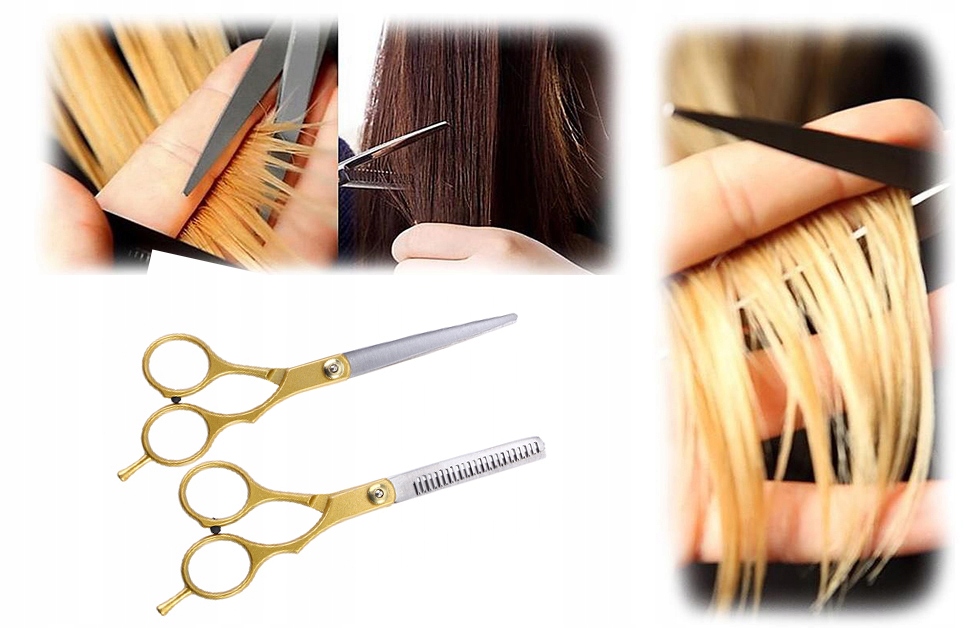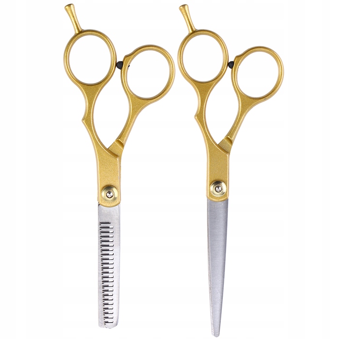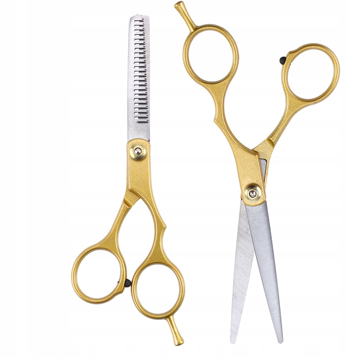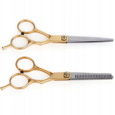 Na sprzedaż fabrycznie nowy, dobrej jakości komplet (2 szt.) nożyczek. Zestaw w skład którego wchodzą tradycyjne nożyczki fryzjerskie + degażówki do cieniowania. Nożyczki są wykonane ze stali nierdzewnej. Zestaw odpowiedni do zastosowań w zakładach fryzjerskich jak i w domu.